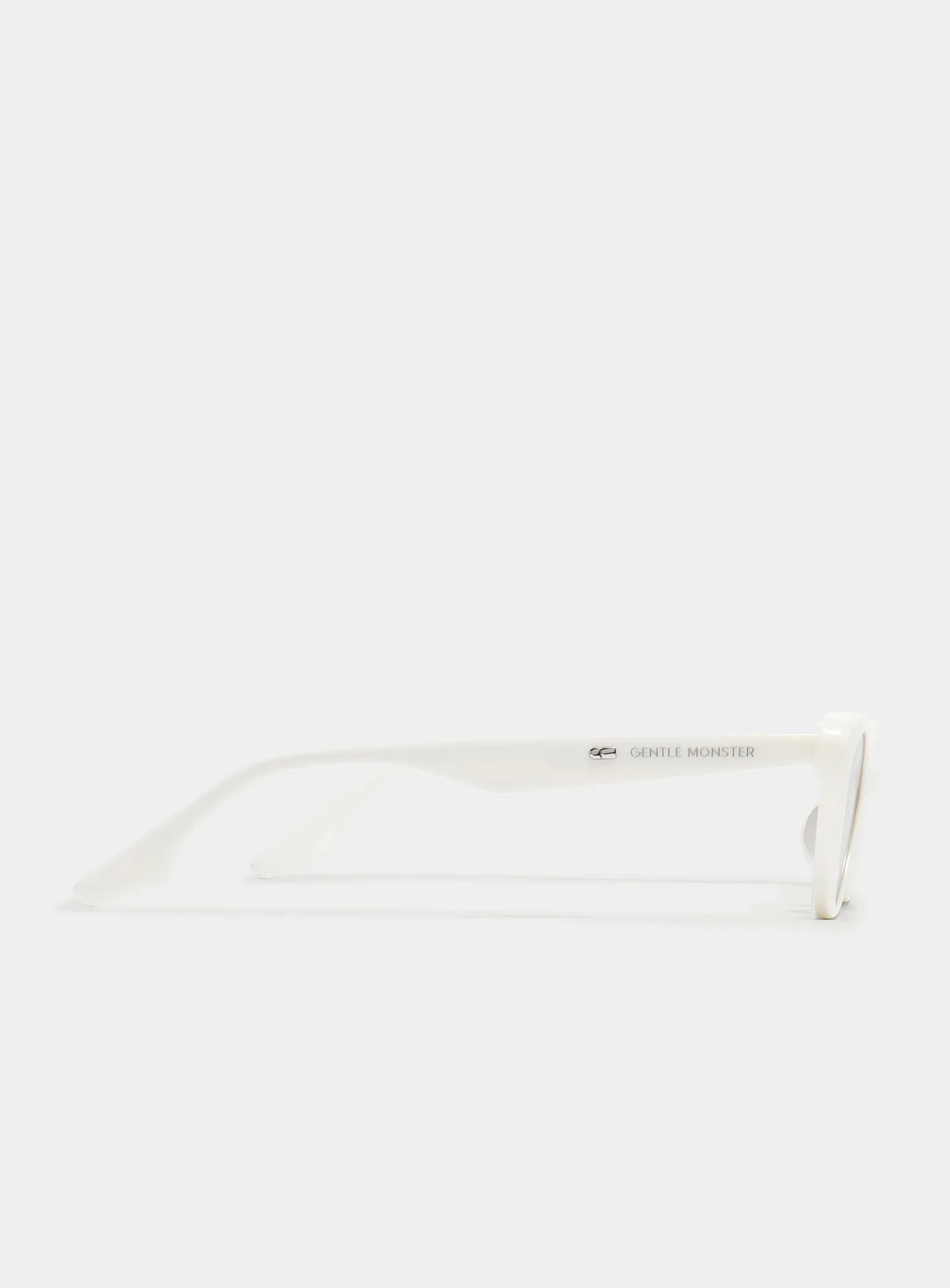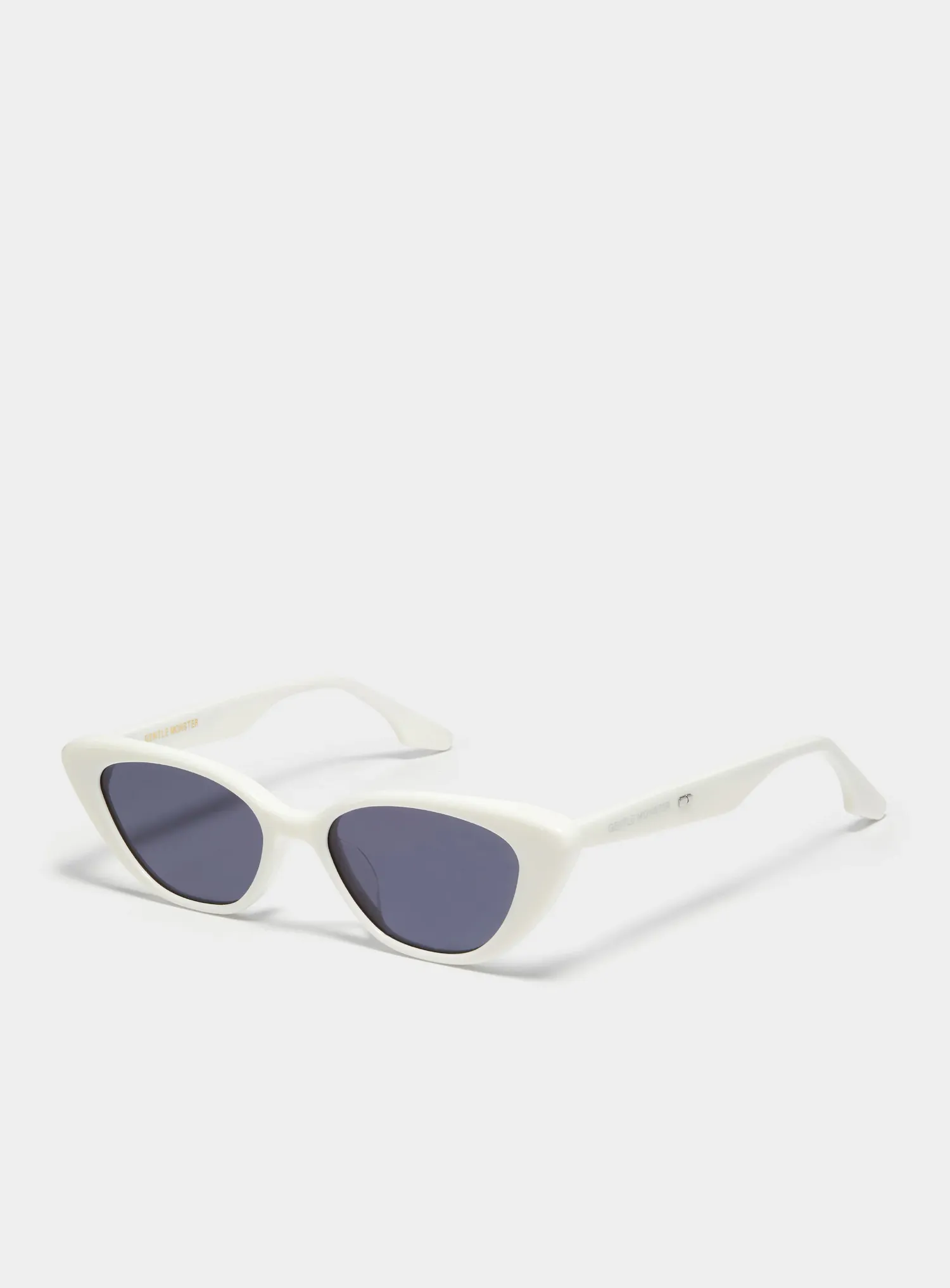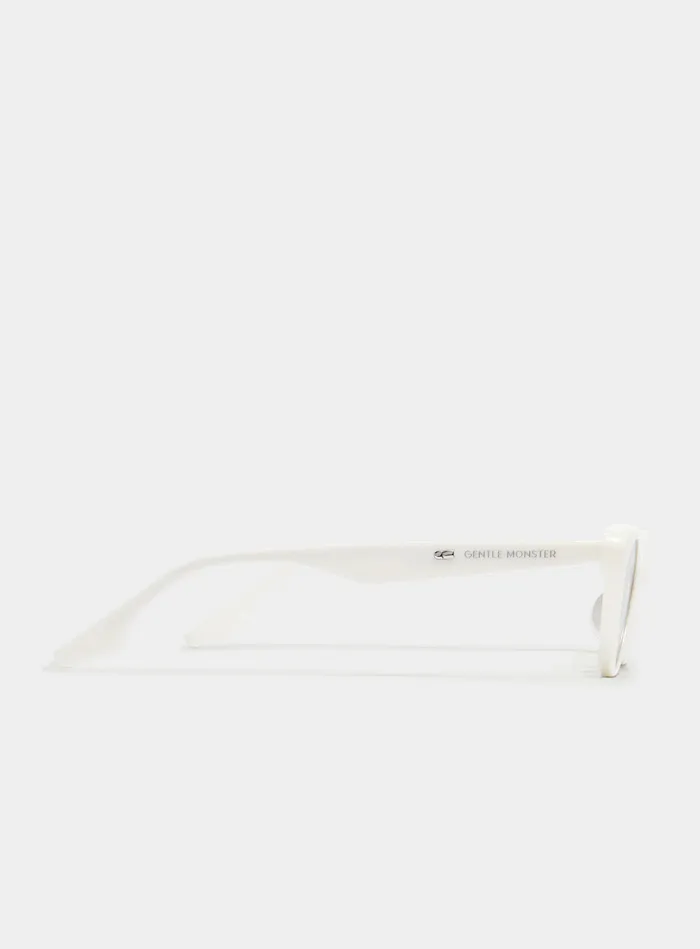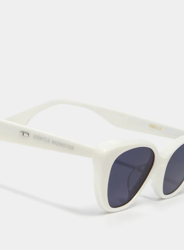 Crella W1 is a slim cat-eye crafted from white acetate. The compact front is bold and voluminous yet well-balanced, creating an eye-catching silhouette. The temples feature the Gentle Monster logo accentuated by a metal detail, while the frame houses navy lenses with 99.9% UV protection.