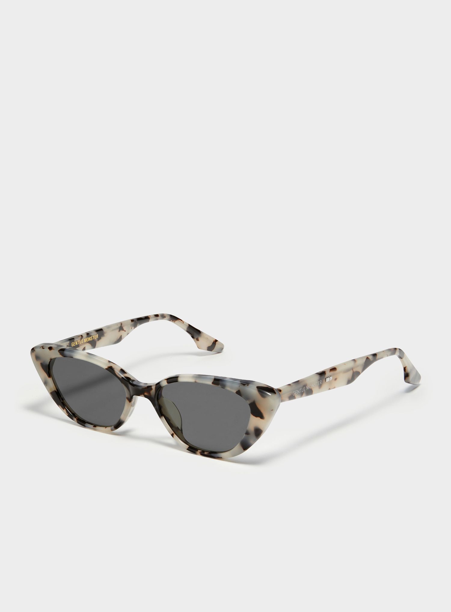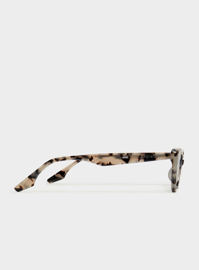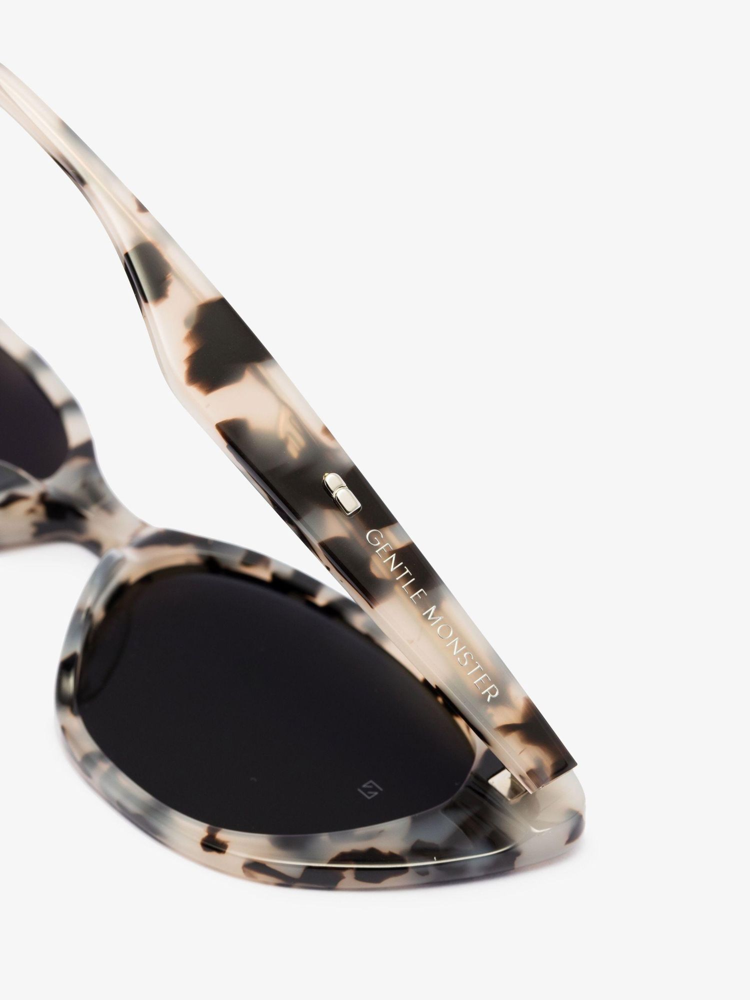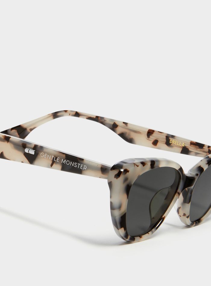 Crella S3 is a slim cat-eye crafted from cream tortoise acetate. The compact front is bold and voluminous yet well-balanced, creating an eye-catching silhouette. The temples feature the Gentle Monster logo accentuated by a metal detail, while the frame houses black lenses with 99.9% UV protection.