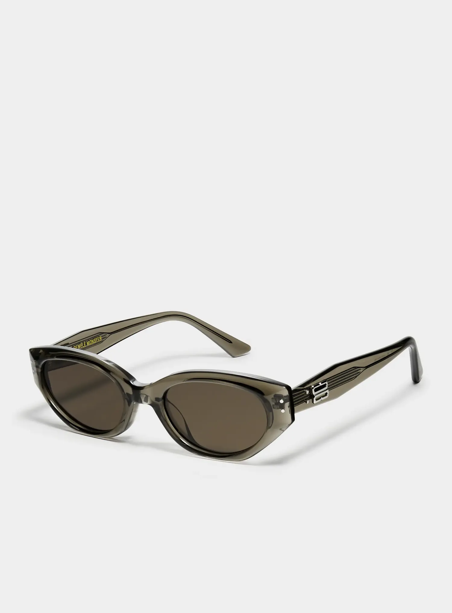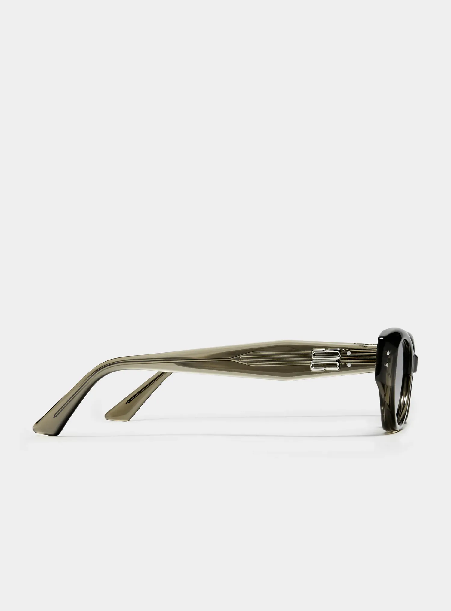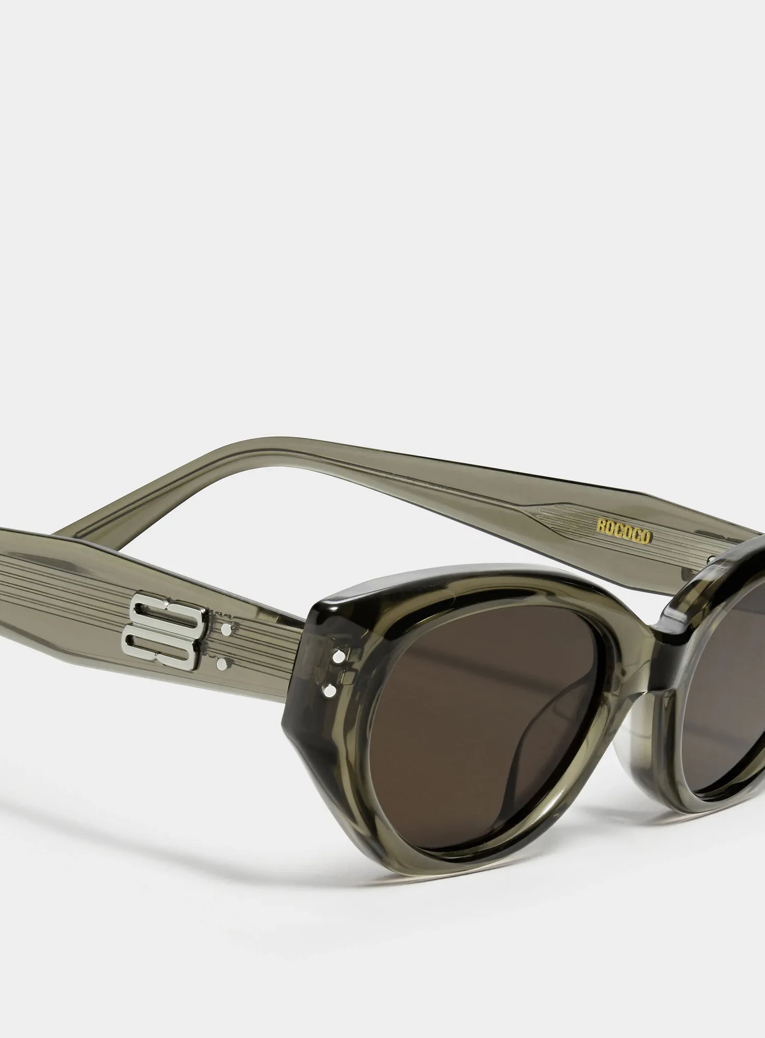Discover the Rococo KC6 sunglasses from Gentle Monster’s 2023 Collection. The straight lines of this voluminous silhouette immediately draw the eye to a composition that stands out for its remarkable design. Featuring an alluring khaki frame, the iconic metal detail on the translucent temples adds a touch of sophistication to this piece.