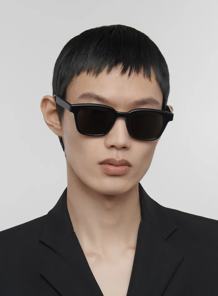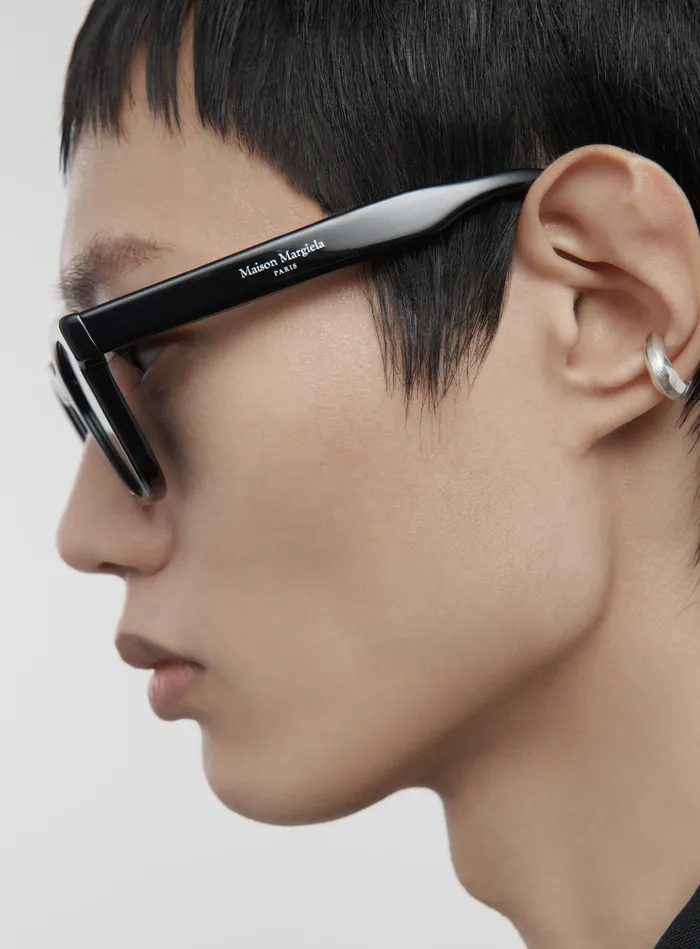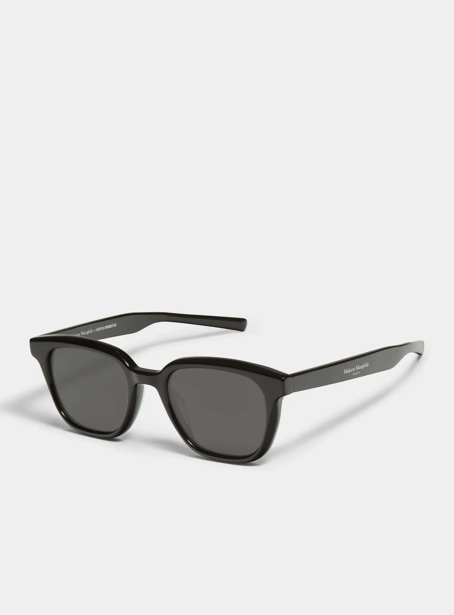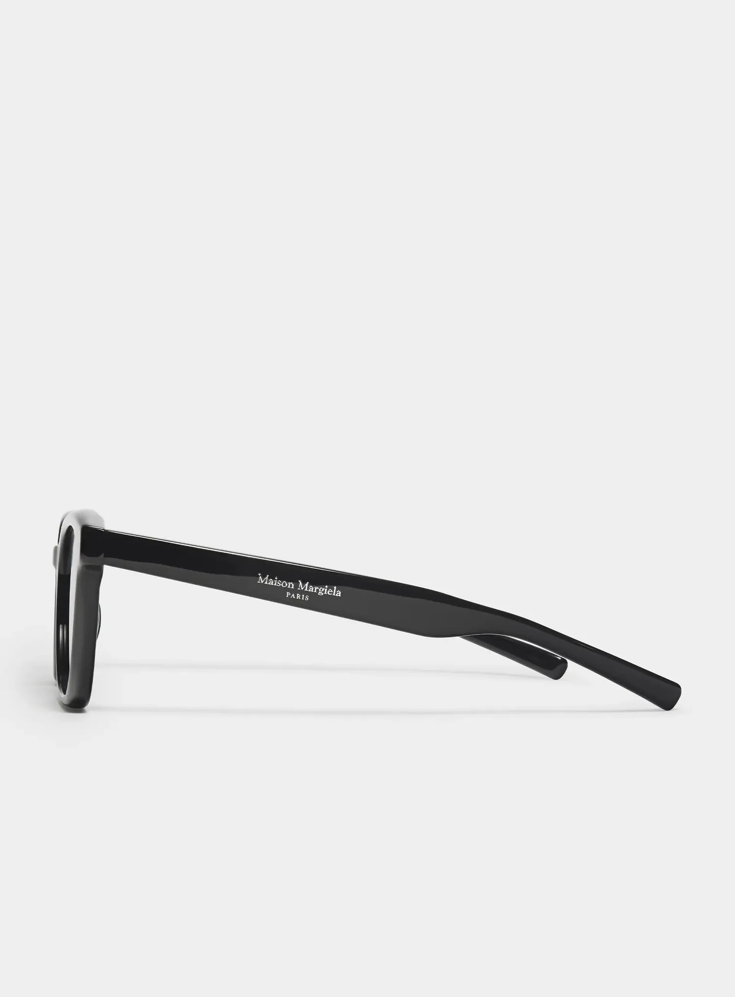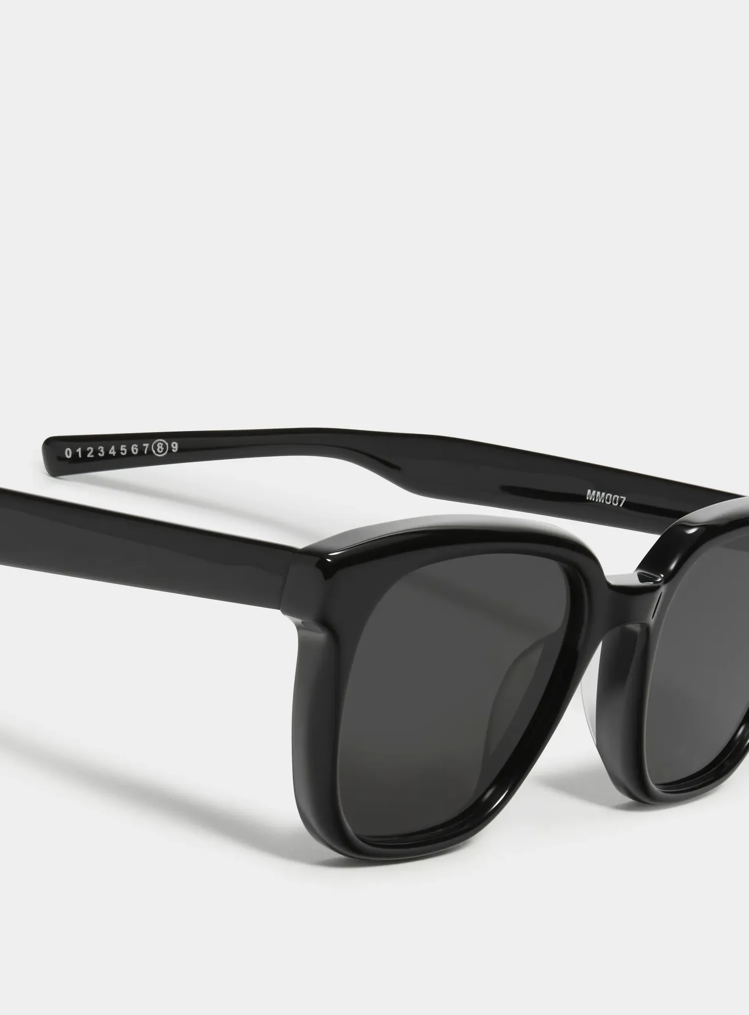 The MM007 01 sunglasses feature a curved square silhouette structured from black acetate. The left side is adorned with the Maison Margiela logo, and the tip of the inner left temple is embellished with the Maison Margiela's numeric logo with 8 encircled.